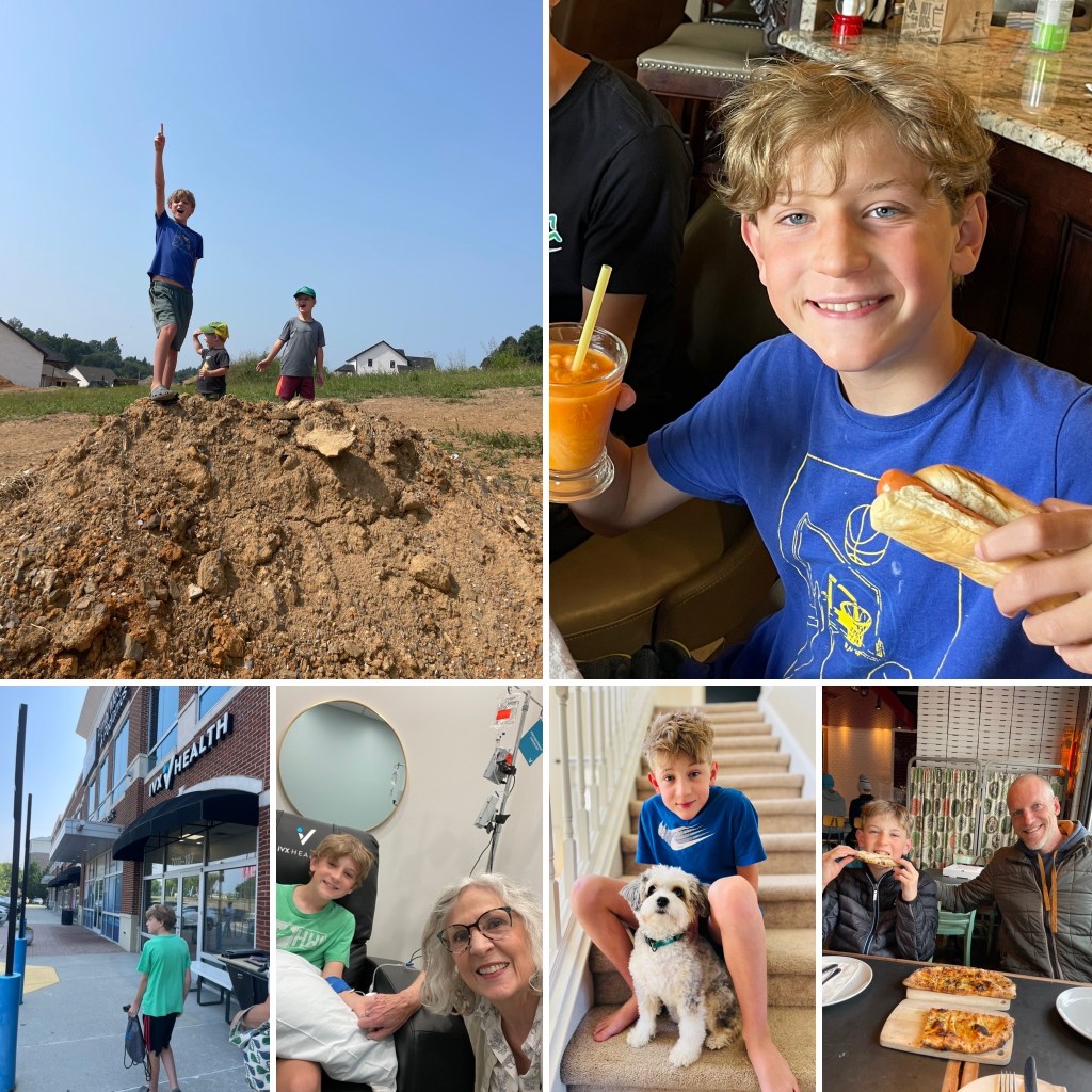 Our 11 year old grandson has mountains to climb and hard things to do……. and pizza to eat, Pals dogs to love, Jasper dogs to play with,…… is this his meaningful work?